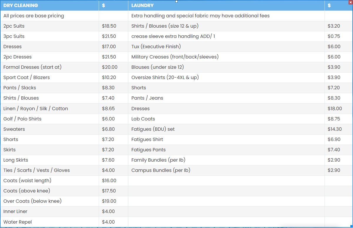 Shirt laundering includes pre-spotting, washing, and professionally pressing. Your shirts can be returned to you hung on a hanger or boxed for your traveling needs. Lab coats, smocks, fatigues, uniforms, chef coats, and blue jeans are also commonly laundered. We also offer wash, dry, and fold for your personal items.